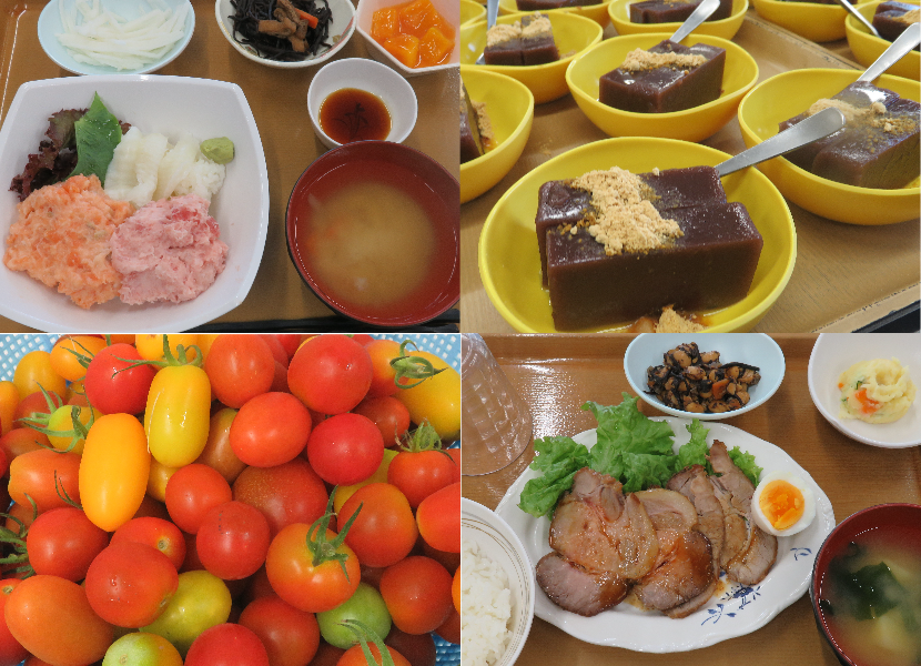 畑でとれた新鮮な野菜と、市場直送のお魚や果物を使った料理が満載です。施設に入所されたご利用者様は、3ヶ月に1回、栄養ケア計画書を作成し、基礎疾患や健康状態によって食事を工夫しています。食事を楽しみながらも、健康や運動機能の維持、向上を目指して提供しております。